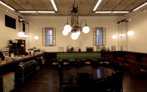 カフェに足を踏み入れると、高い天井、石造りの壁、そして重厚な鉄格子など、銀行時代の面影がそのまま残る、壮麗でクラシカルな空間が広がっています。特に大きな窓から差し込む光が、歴史的な空間を明るく照らし、非日常的な雰囲気を醸し出しています。